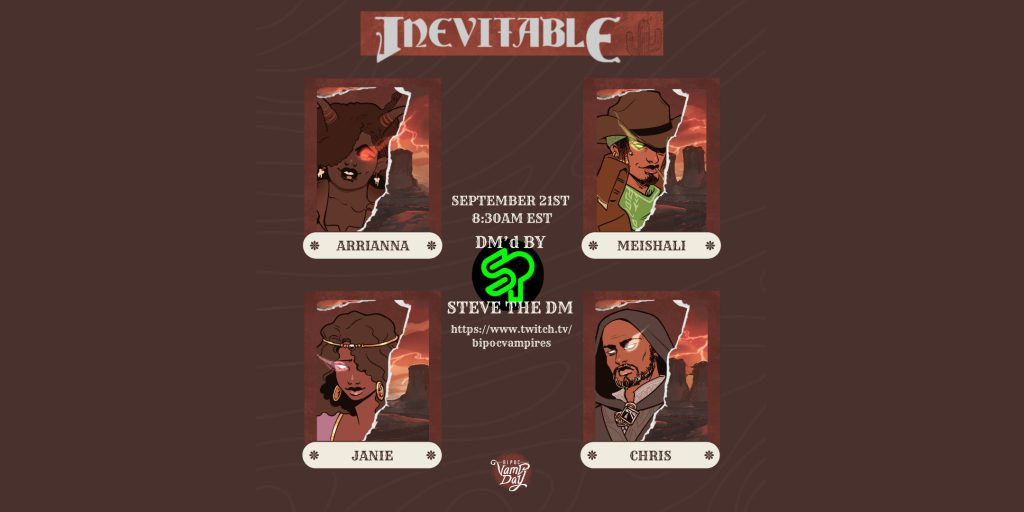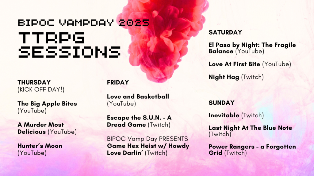 Enjoying our TTRPG games? Support BIPOC VampDay and donate to our charity fundraiser. Want to join us next year for TTRPG gaming next year?Contact us